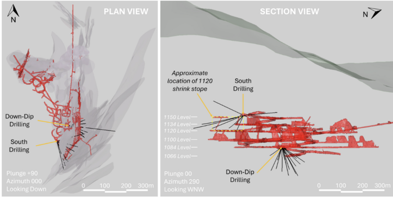 Up-dip drilling above level 1120, near the planned shrink stope, has also returned high-grade intersections, such as 93.33 g/t over 0.7 metres and 164 g/t over 0.3 metres. Development of the 1120 shrink stope has already started, and drilling will continue to provide additional information for mining.
