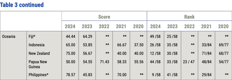 Fiji was the best-performing country in Oceania, ranking 31st, followed by New Zealand at 43rd. Papua New Guinea placed 57th while the Solomon Islands came in last at 84th, due to tied scores despite only 82 jurisdictions being listed.